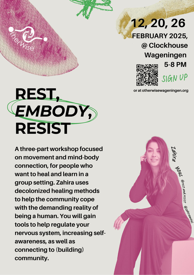 Rest And Resist emerged as a platform for needing a supportive and safe space for fellow activists and artists fighting for a free Palestine, and beyond. Their work focuses on fighting exhaustion, separation, burnout, harm, and disillusionment in activist movements. If you are longing for a collective space where you can rest with intent to co-regulate, build resilience, supportive networks, mutual care, and trust, this space is for you. As we will use our bodies to move and heal what needs healing, we aim to accommodate bodies of different abilities. If you have any questions or concerns weather this space is for you, please don't hesitate to reach out to us at otherwise@wur.nl .