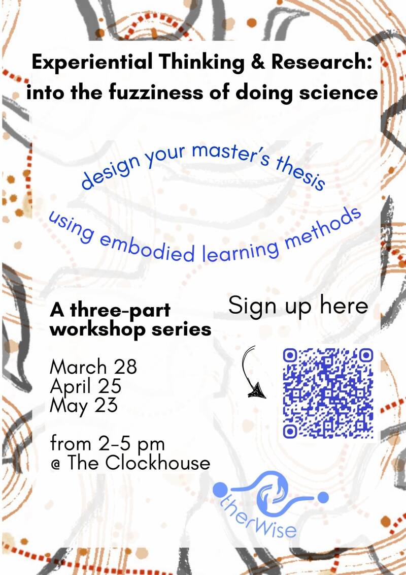 Through three-part workshop series, we will look into thinking beyond abstract reasoning in the head. The workshop series is particularly aimed at WUR masters who are currently thinking about and designing their thesis project. We will explore themes connected to your work as a young researcher; personal values and emotions and your positionality within academia. Through different embodied exercises, the workshops aim to provide spaces where you can develop the capability to remain connected to that which is deeply felt throughout your master's thesis journey.